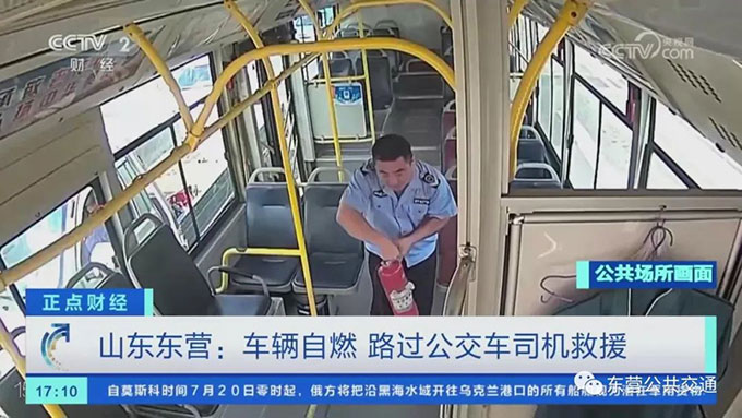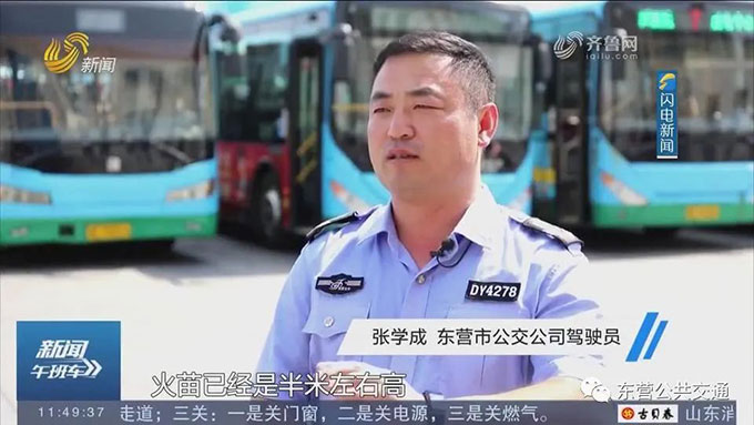 近日在東營,一輛正常行駛的車突然起火,而且是在車流量很大的道路中央。在等紅綠燈的東營公交駕駛員張學成和商衛東看到這一情況后,紛紛拿起車上的滅火器參與救援。