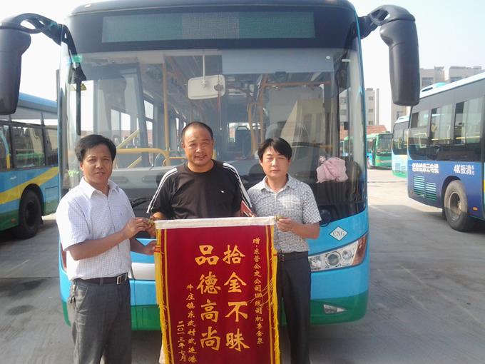 2013年7月29日,東營(yíng)區(qū)牛莊鎮(zhèn)東武村的武連港師傅為公交車駕駛員李金泉送來(lái)了一面“拾金不昧、品德高尚”的錦旗表示感謝。