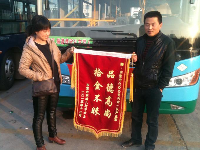 2013年12月5日,東城八村乘客于小梅女士拿著一面寫(xiě)有“拾金不昧、品德高尚”的錦旗來(lái)到市公交公司汽車一隊(duì),感謝車隊(duì)嚴(yán)業(yè)軍師傅拾金不昧的高尚品德。