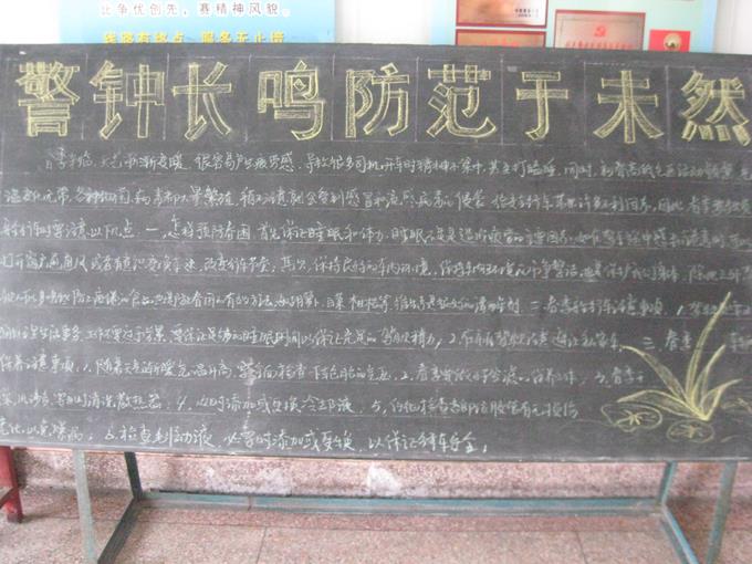 陽春三月,氣溫回升,是讓人感覺最舒服的季節,但由于季節交換,白天變長,人容易出現“春困”現象,尤其是對駕駛員來說,受“春困”影響更大,針對春困現象,汽車三隊一邊做好安全叮囑,要求廣大駕駛員注意行車安全,還專門出了一期黑板報,詳細講解了春季行車注意事項,同時提醒廣大駕駛員晚上要少熬夜,保證足夠的睡眠,中午要盡可能的休息一會,把“春困”影響降低到最小,確保日常行車安全。