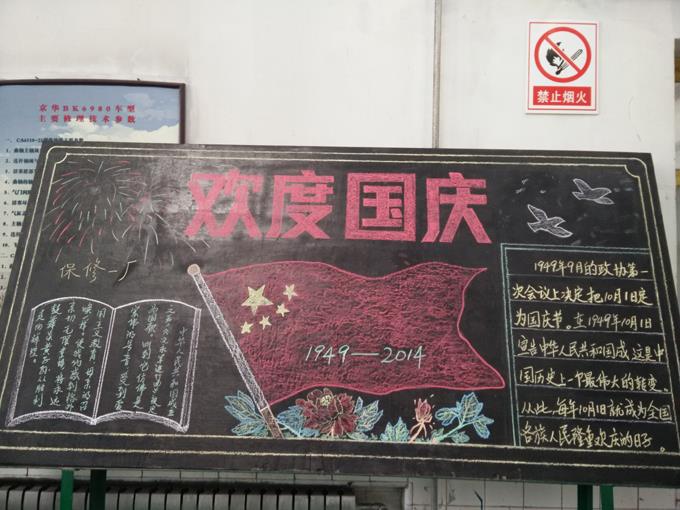 今年是建國65周年,市公交公司保修一廠利用周末時間精心制作了一副黑板報,來表達對祖國母親生日的祝福。