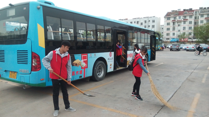 來自東營職業學院青年志愿者協會的學生和市公交公司汽車一隊職工共計30余人,分成兩個小組,一組打掃停車場衛生,撿拾地上果皮紙屑,另外一組幫助駕駛員擦拭車身,清掃車廂衛生。大家干得熱火朝天,不到兩個小時,公交車和停車場被大家打掃得干干凈凈。