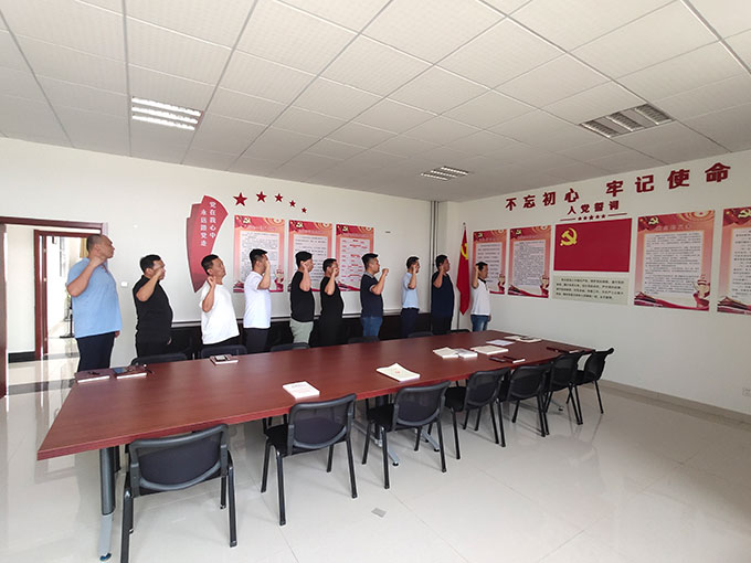面對鮮紅的黨旗,五隊支部書記王健同志作為領誓人,帶領全體黨員一起高舉右手,再次莊嚴宣誓。“我志愿加入中國共產黨……隨時準備為黨和人民犧牲一切,永不叛黨?!辩H鏘恢宏的誓詞,強烈震撼著在場的每一位黨員,一字一句,神圣而豪邁,體現了黨員同志們對中國共產黨的無限忠誠。