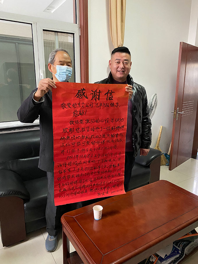 12月9日上午,東營市公交公司汽車六隊的辦公樓里來了兩位手捧大紅色感謝信的老人家。上面寫著“感謝您教育培養(yǎng)了一位好師傅,他熱情地幫助并找回了遺失的背包。”
