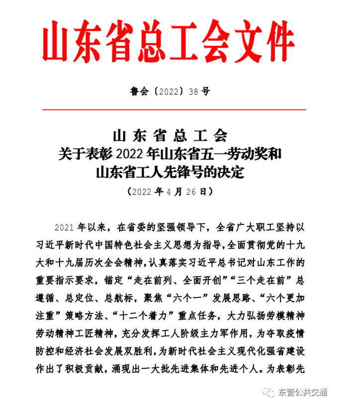 為進一步激勵廣大職工在新時代勇擔新使命,展現新作為,“五一”前夕,山東省總工會和東營市總工會先后印發通報表彰,對省市多家先進集體和個人進行表彰,東營市公共交通汽車公司駕駛員黃新強同志被評為山東省五一勞動獎章,東營市公共交通汽車公司9路車組被評為東營市工人先鋒號。