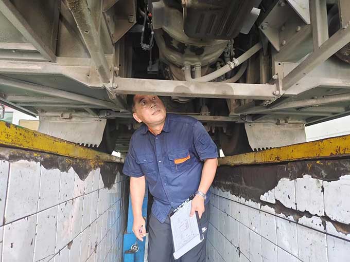 驕陽似火,汗水流淌,沾了頭發,濕了臉頰,卻阻擋不了他們對工作的熱情,這是一種承諾,更是一種責任與擔當。相比爬車頂維修空調的辛苦,鉆地溝也的滋味更不好受。不足一米深的地溝里,不僅悶熱,而且容易沾滿油垢。背靠堅硬的水泥瓷磚、頭頂公交車底盤,承受車輛部件散發的熱量,猶如鉆進烤箱。狹小的空間內,悶熱的空氣彌漫著刺鼻的機油味,底盤零部件上的塵土和油污隨著維修時的觸碰不時地落在頭上、脖子里、衣服上。為了排查故障,維修職工需要一直貓著腰、歪著頭,手上、身上滿是機油和污垢。幾分鐘的時間,豆大的汗珠就成串往下掉,工作服更是緊緊地“貼”在了身上。有時候,要檢修的部位比較靠里,在車底也無法觸及,只能從車廂里打開后座,順著幾十厘米直徑的小洞‘鉆進去’,基本上就是上半身在發動艙內,下半向在車廂內。盡管如此,保修職工仍然憑借頑強的斗志和精益求精的工匠意識,克服重重困難,完成各項保修任務。