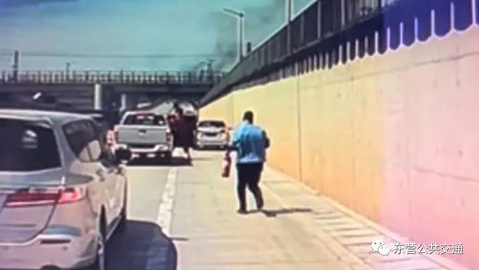 6月30下午,蘇文海像往常一樣駕駛著51路公交車由北往南方向行駛至六戶附近時,看到前面壓車情況嚴重,就慢慢把車停了下來。接著他發現在遠處一輛私家車正冒著滾滾濃煙,車上的一堆家具,外包裝已經有了明火,車主和周圍旁觀市民正手足無措的站在車旁邊,情況十分緊急。蘇文海見狀立刻打開公交車應急雙閃燈,提著車里的兩個滅火器就沖了下去。