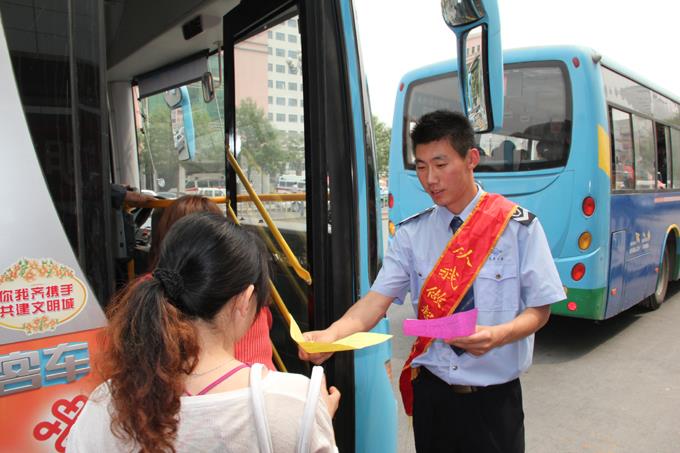 “文明乘車,從我做起” 文明勸導(dǎo)活動由市公交公司創(chuàng)城活動領(lǐng)導(dǎo)小組統(tǒng)一安排部署執(zhí)行,公司領(lǐng)導(dǎo)班子和各車隊隊長親臨上陣,投入到活動中。本次活動市公交公司共制作創(chuàng)城宣傳橫幅7幅,印制“文明乘車,從我做起”倡議書2000余份,綬帶14條?;顒拥拈_展有效地規(guī)范了公交車輛進出站秩序,整治了公交站點環(huán)境衛(wèi)生,增強了市民“有序乘車,文明禮讓”的乘車意識,為全市“五城聯(lián)動”創(chuàng)建工作做出了積極的貢獻。