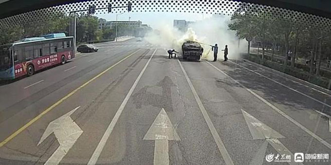 9月10日13點03分,東營公交通勤車隊駕駛員王維明像往常一樣執行124路公交車運營任務,當他駕車行駛到沂州路與瀏陽河路交叉口紅綠燈時,發現了異常情況——前方一輛貨車起火了,王師傅沒有絲毫畏懼,立即停車開門,提起車載滅火器沖下了車。