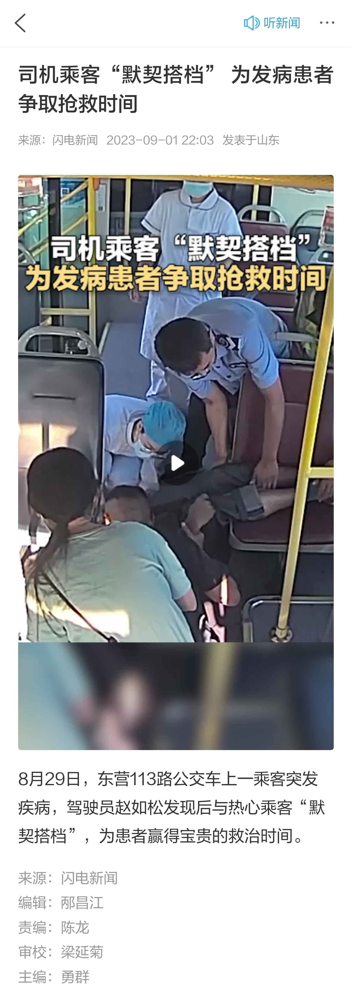 2023年8月29日下午4點58分左右,正在駕駛113路公交車的趙如松聽到了車內乘客的呼救。他從車內后視鏡看過去,發現車內一男性乘客正在渾身抽搐,然后倒地不起,此時,坐在他后方的一名乘客見狀,立馬跑到駕駛員旁邊呼救。趙如松師傅馬上靠邊停車,并上前查看乘客情況,因接受過急救培訓,趙師傅立馬判斷,該乘客可能是突發疾病,在向公司匯報并征得車內乘客同意后,立即將公交車開往醫院,為患者爭取急救時間。車輛到達到市人民醫院南門后,趙如松和急救人員合力將患者抬到急救擔架上,一起送到急救室,看著他情況穩定后,才返回工作崗位駕車駛離。